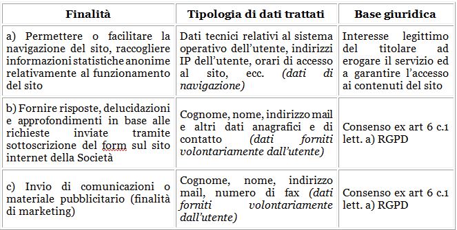 - Finalità del trattamento, tipologia di dati e relativa base giuridica
